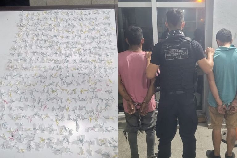 Al revisar sus pertenencias, los oficiales hallaron los envoltorios de nylon que contenían clorhidrato de cocaína. Los detenidos fueron identificados como Juan Jaime T., de 20 años, y Juan Pablo E., de 27, quienes fueron trasladados a una comisaría cercana para quedar a disposición de la Justicia.